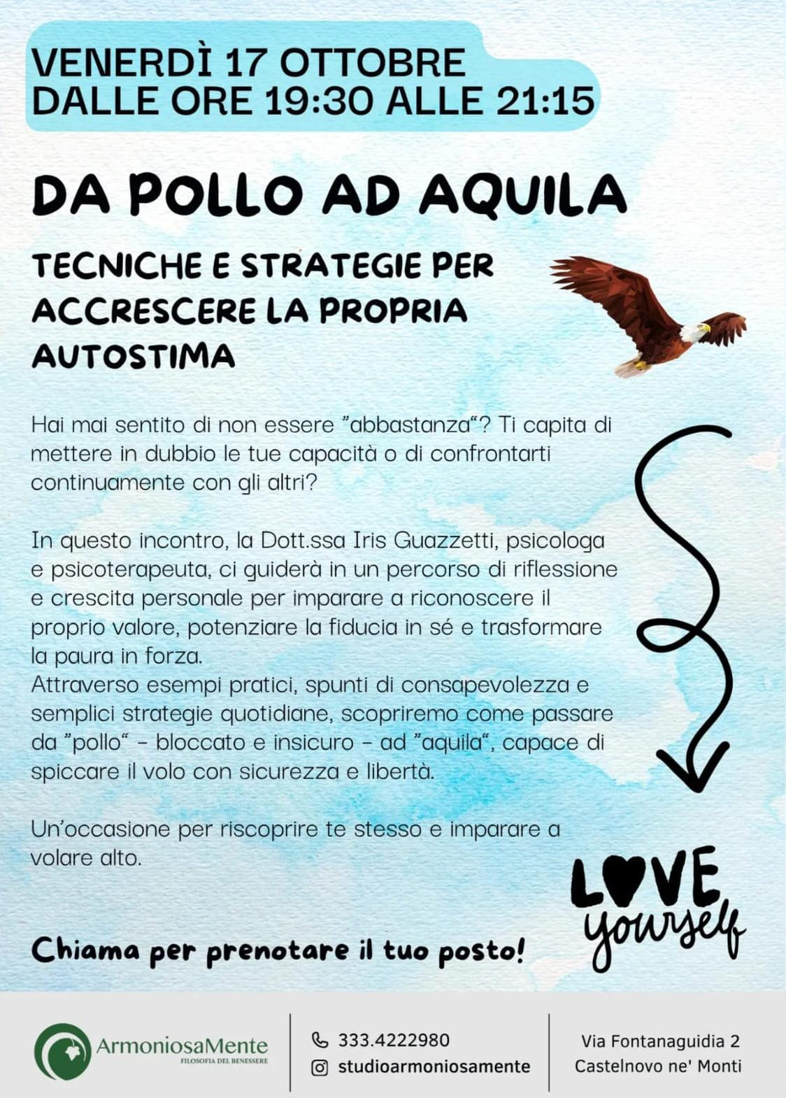 Attraverso esempi pratici, spunti di consapevolezza e semplici strategie quotidiane, scopriremo come passare da “pollo” – bloccato e insicuro – ad “aquila”, capace di spiccare il volo con sicurezza e libertà.
